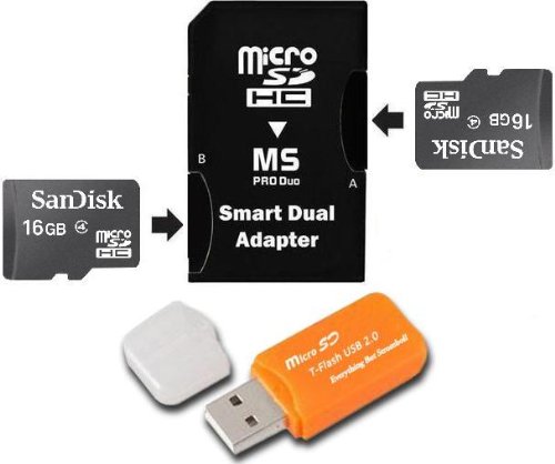 Two Sandisk 16GB Class 4 MicroSDHC Cards plus Dual Slot MicroSDHC to MS Pro Duo Adapter bundle. The included adapter converts both of the 16GB MicroSDHC Cards into one 32GB MS Pro Duo Card for use with Pro Duo enabled devices, including PSP. *IMPORTANT* NOTE: 1. Please FORMAT MicroSD cards with Dual adapter on a SONY product or PSP before using the card.(DO NOT FORMAT with by a PC) 2. Keep Micro SD cards the adapter all times for data transfer. DO NOT transfer data from Micro SD cards without the adapter to any other device(PC) . Doing so will cause data corruption. 3. Most card readers DO NOT support high capacity Memory Stick Pro Duo memory cards. Please use a USB cable to transfer data from your PSP or SONY products to your PC or other device. 4. For customers using PSP system software version 2.80 or earlier: PSP systems with system software version 2.80 or earlier do not correctly recognize high-capacity Memory Stick PRO DuoTM with more than 4 GB of free (recordable) memory space. Please update.Sandisk 32GB 32G (16GB x 2) Class 4 microSD microSDHC Card with Dual MicroSDHC to Memory Stick MS Pro Duo Adapter for Sony PSP and Cybershot Cameras with Everything But Stromboli Micro SD HC Memory card Reader Feature